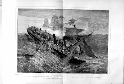 It was a clear, fine night, and by this time the Ville du Havre was in mid Atlantic where ocean is 3 miles deep. Lights of another vessel could clearly be seen several miles away, but approaching. This was the Lochearn, a British merchantman, built in Glasgow in 1869, which was powered by sail alone. As they approached each other, it was the responsibility of the steamship to take avoiding action. However, at the last minute, an error of judgement caused the steamship Ville du Havre to sail across the bows of the iron clad sailing merchant vessel, which struck her amidships at full speed with devastating effect. The Captain was just coming back on deck after his sleep at the time the bowsprit of the Lochearn crossed the side of the Ville du Havre a split second before the impact. It was shortly before 2am on 22nd November. Captain Marius Surmont immediately ordered the launching of the life boats, and two of the eight were quickly got away, though mostly with crew members aboard. As passengers hurried on deck, many only in their night attire and began to realise their dire plight, the main mast collapsed, destroying several life boats still in their davits, which were already filling with passengers, and the mizzen mast also fell forwards killing a number of people. Then, the bows of the stricken vessel broke away, and sank. The remainder of the hull quickly followed, just twelve minutes after the initial collision, throwing the survivors who were still on deck into the freezing water, and drawing many down after her as she sank.